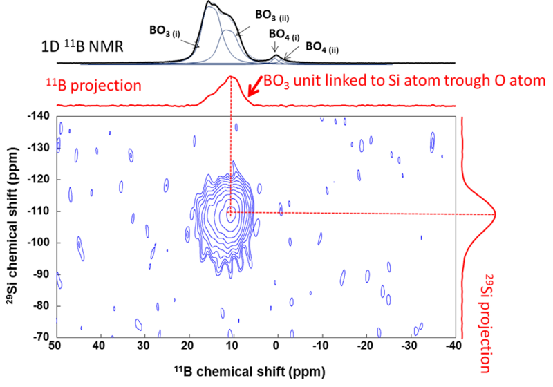 Spectre RMN de corrélation 11B-29Si d'une peinture intumescente en rotation à l’angle magique, à B0=18.8 T, sonde 3,2mm HXY.