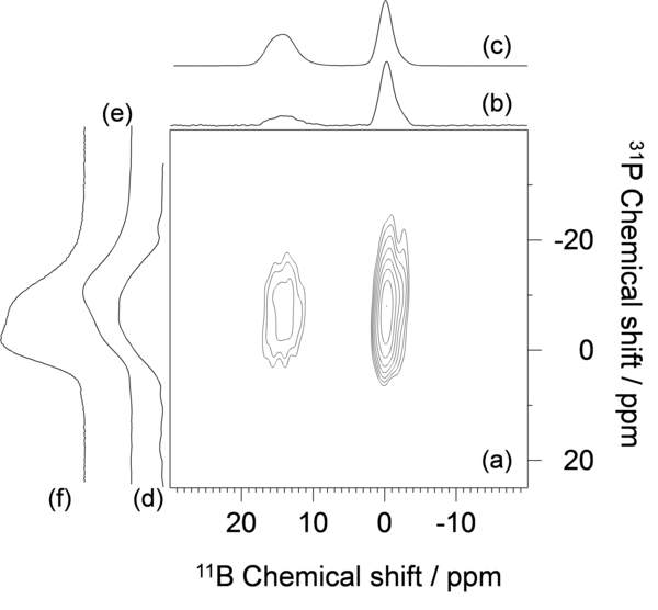 Spectre 2D de corrélation dipolaire 11B/31P sur des verres de borophosphate de lithium, enregistré à 18,8 T sur une sonde prototype BP-3,2mm.